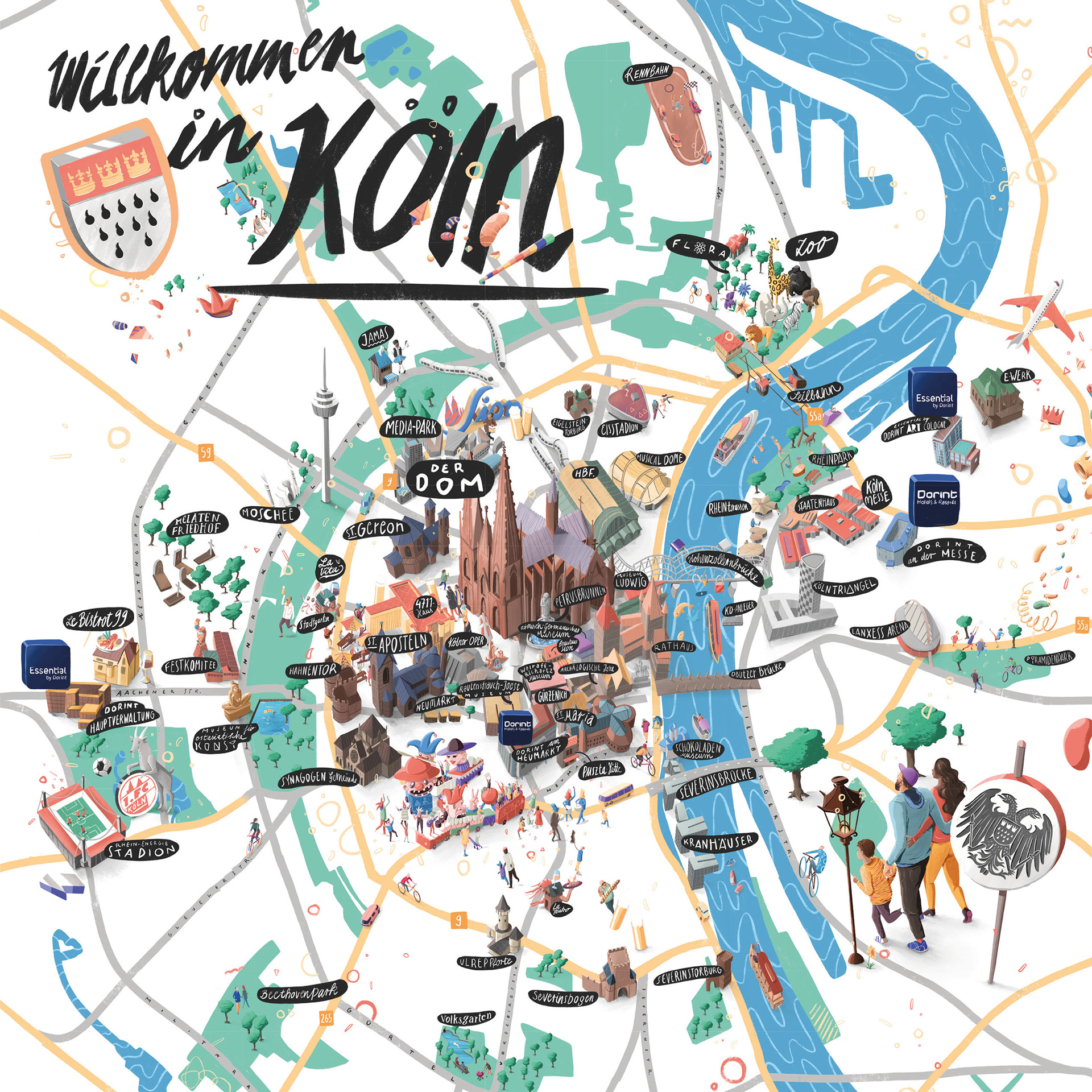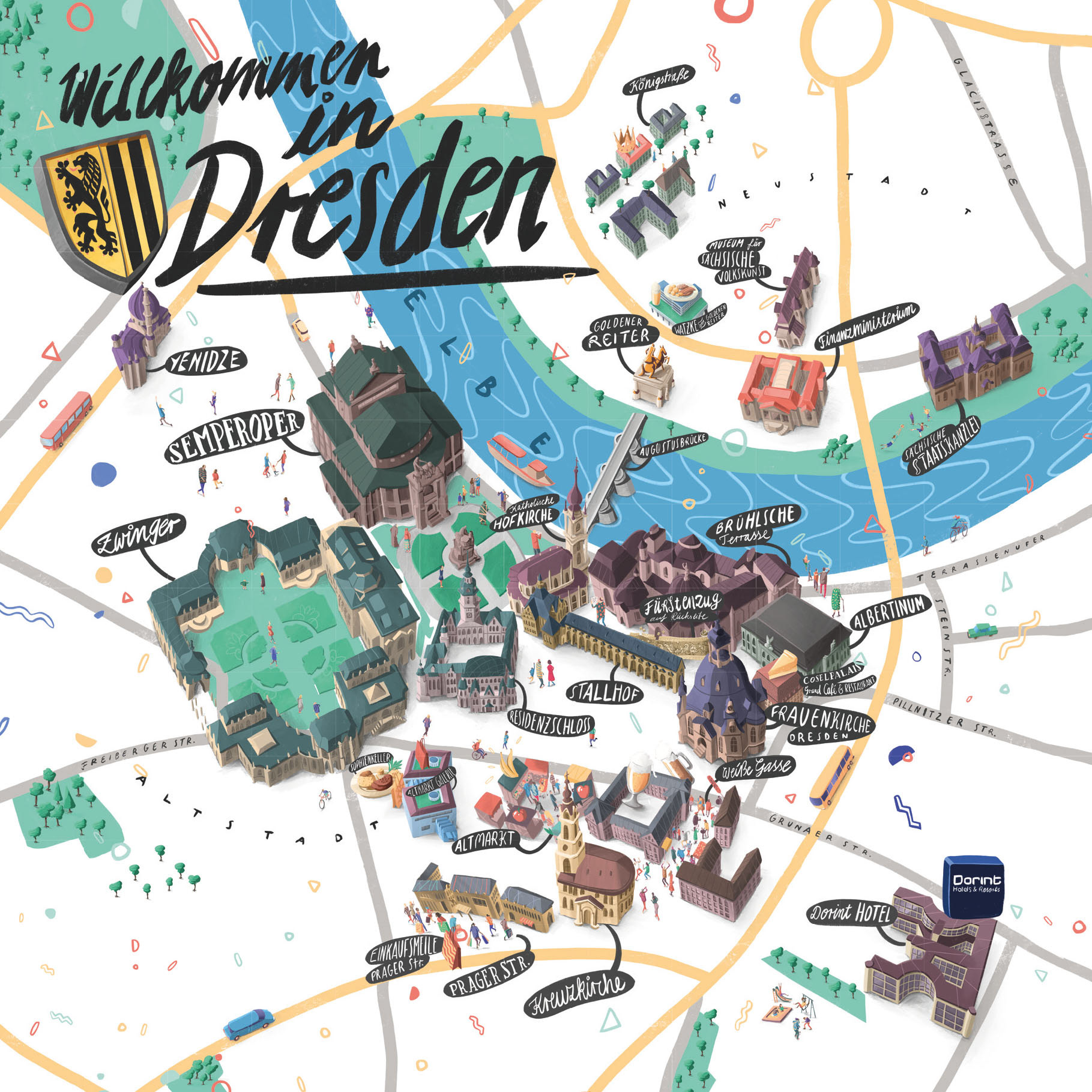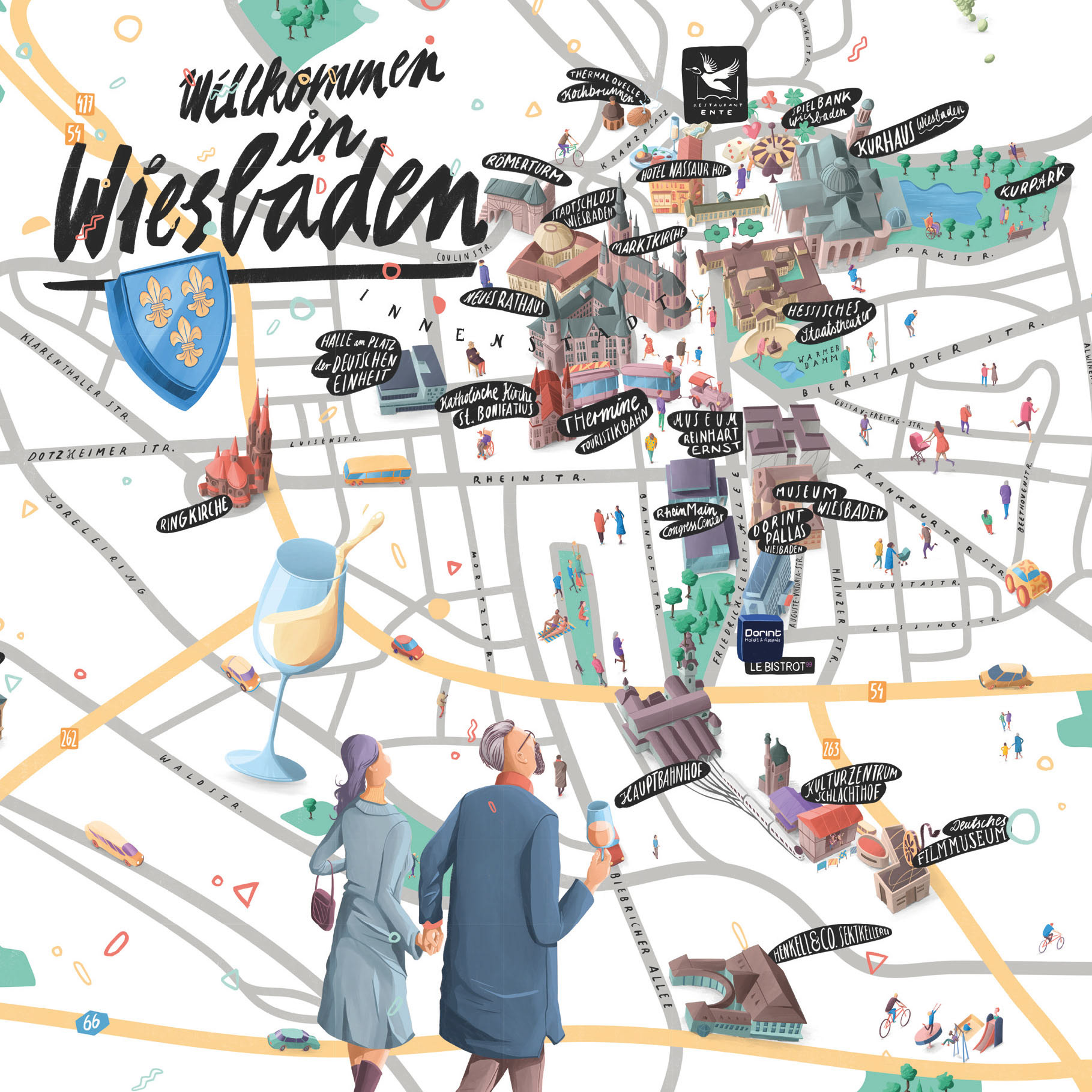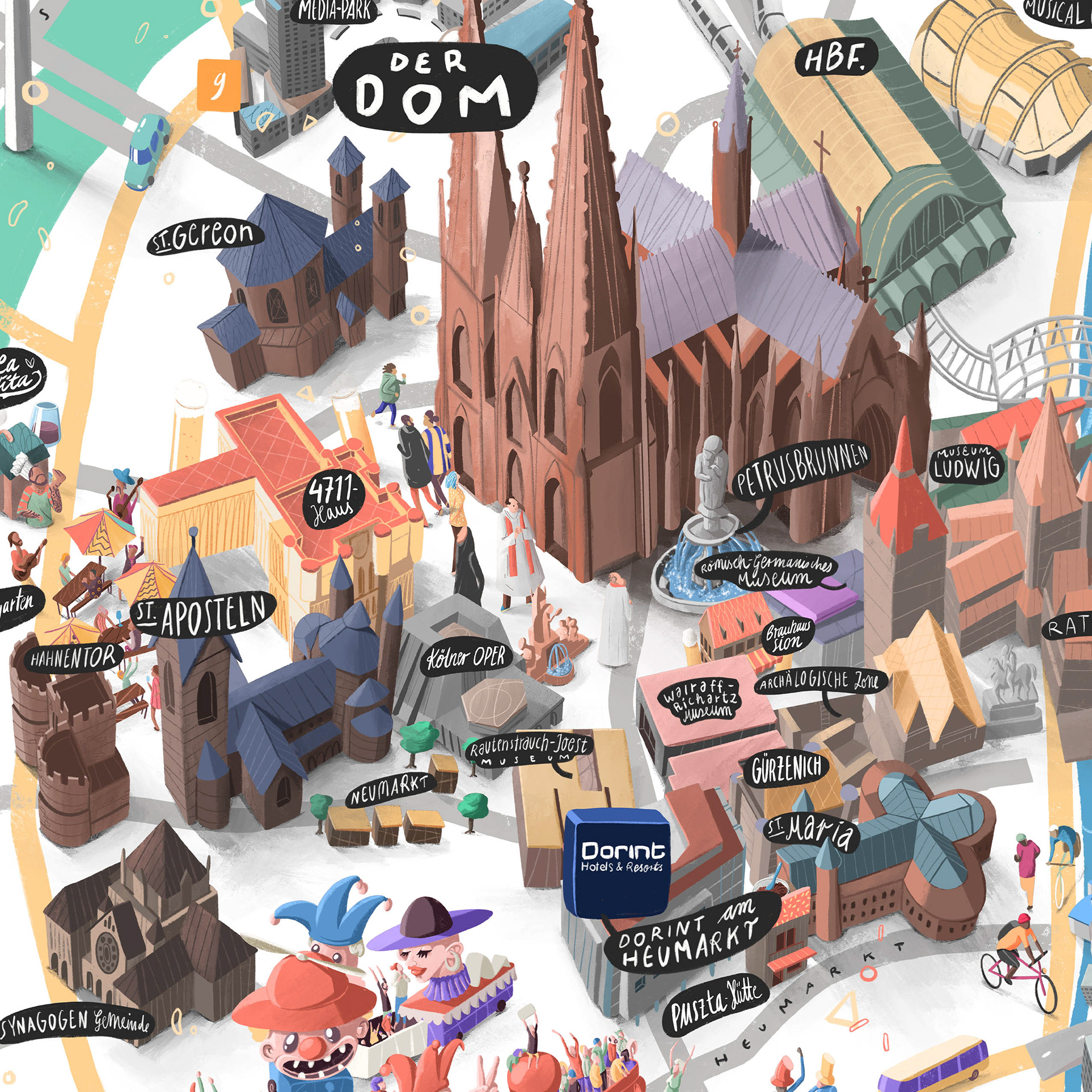 Illustrated maps of 6 German cities for Dorint Hotels. Diplayed in the hotel lobby and other print media.